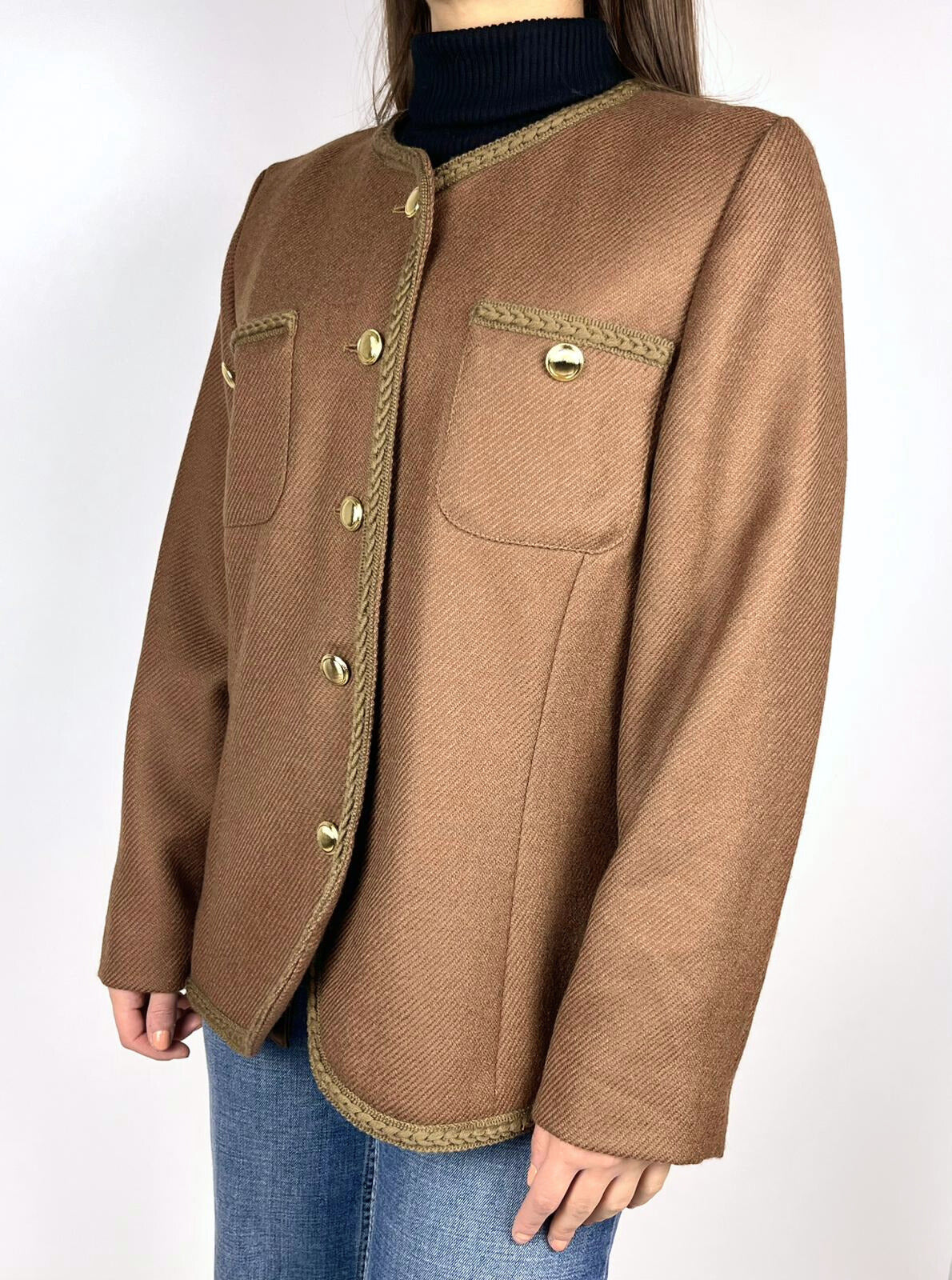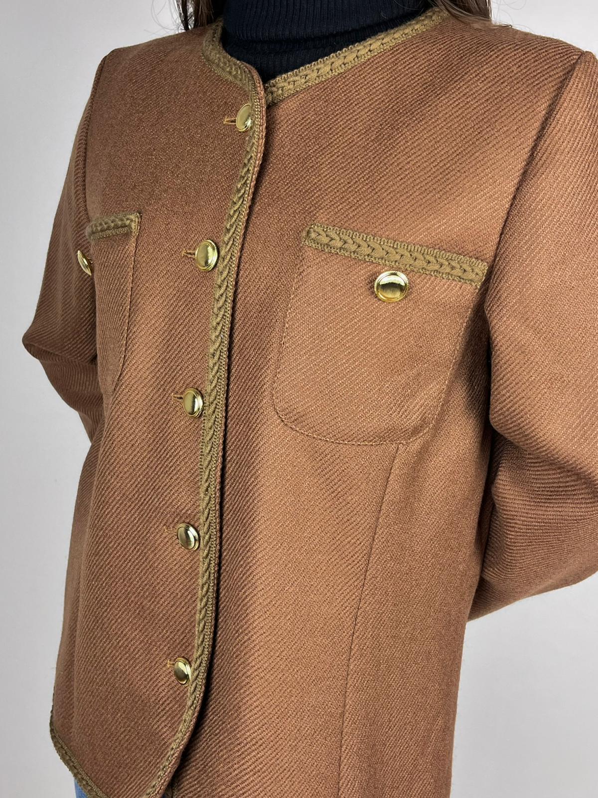 Giacca vintage firmata Luisa Spagnoli, realizzata in lana di alta qualità. Il capo presenta un design elegante arricchito da decorazioni intrecciate lungo i bordi e le tasche, oltre a bottoni dorati che donano luminosità.