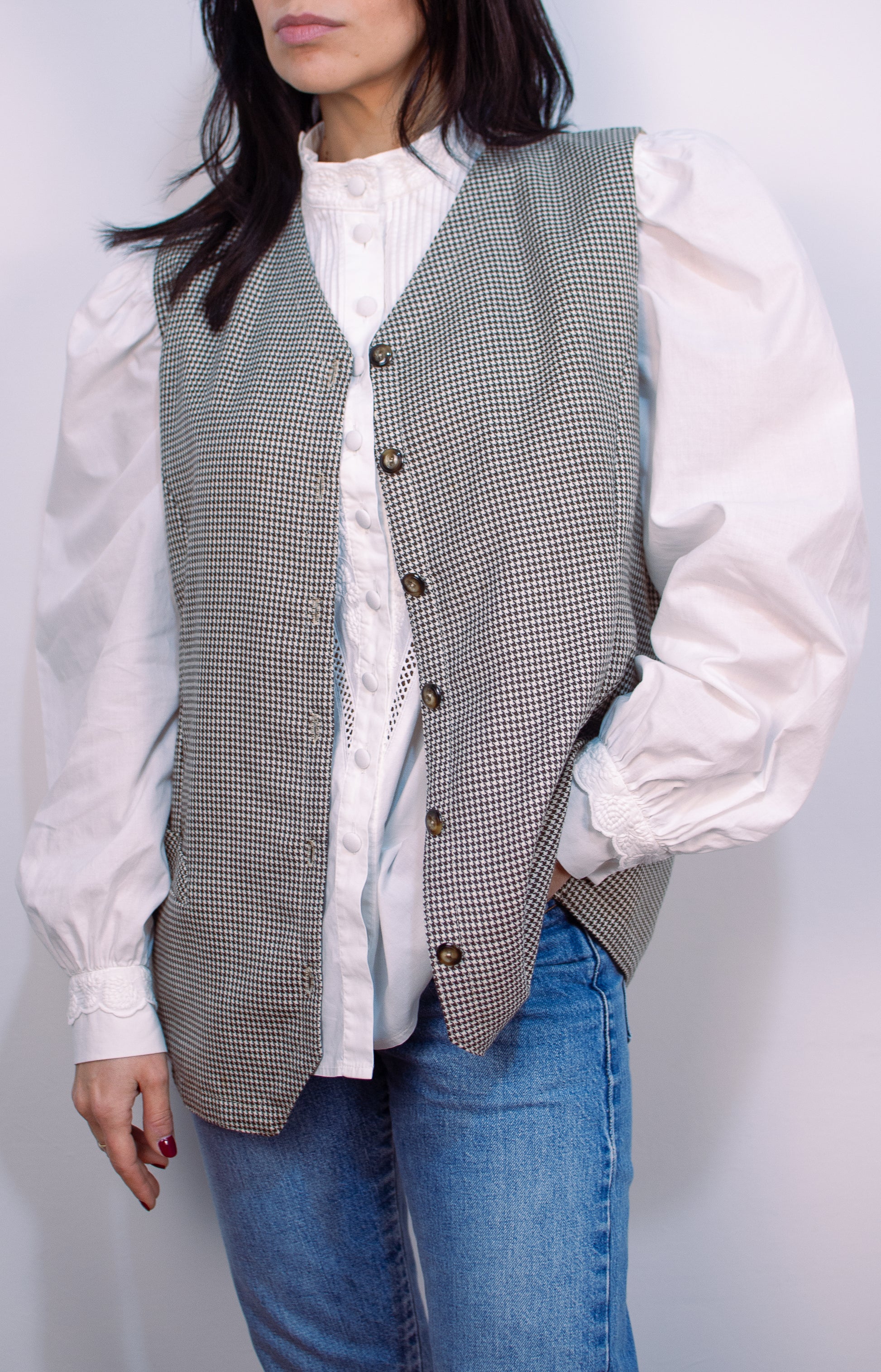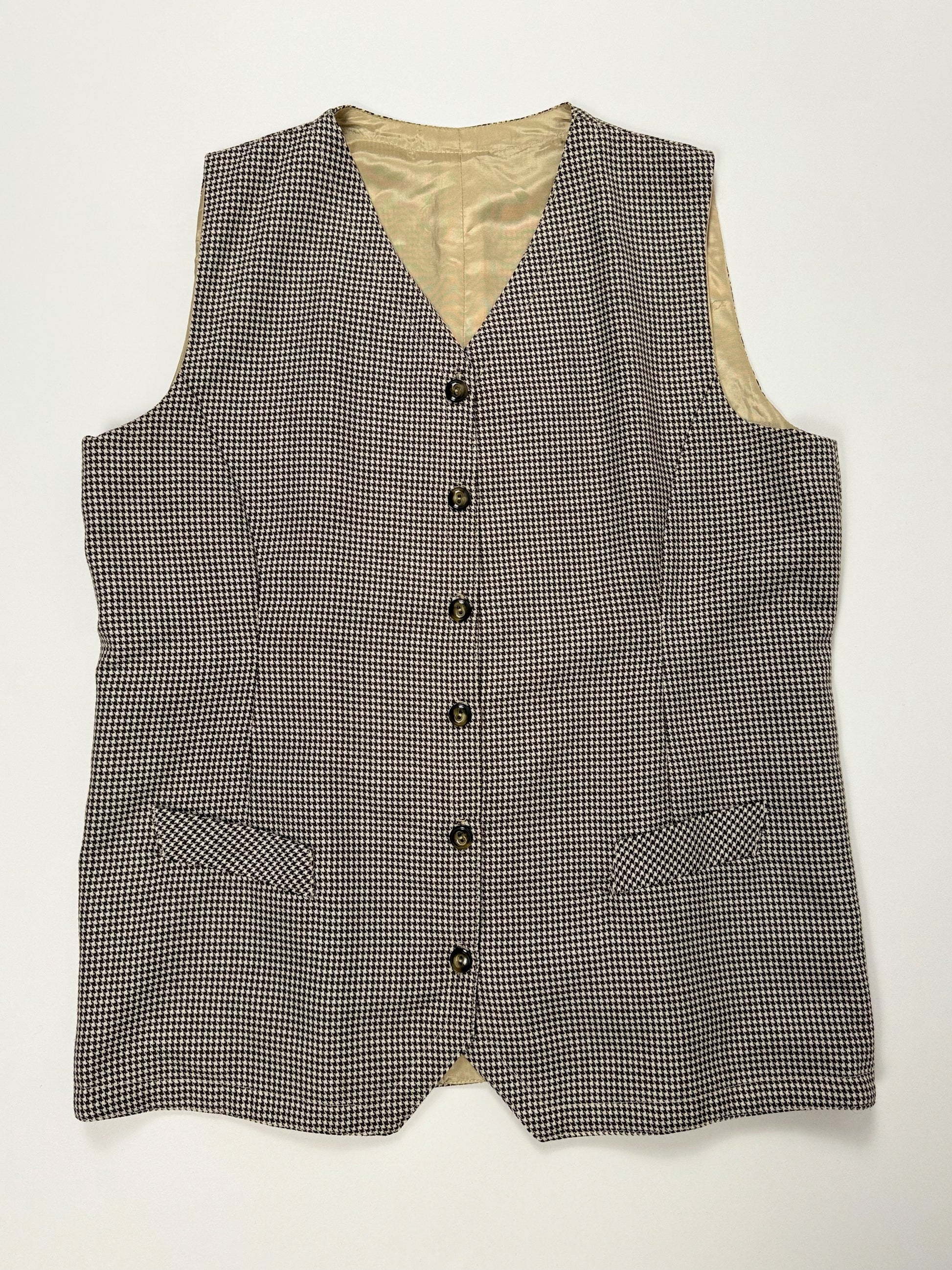 Gilet sartoriale a fantasia pied de poule marrone e beige ed interno foderato in viscosa beige. Chiusura con bottoni e due taschine laterali.