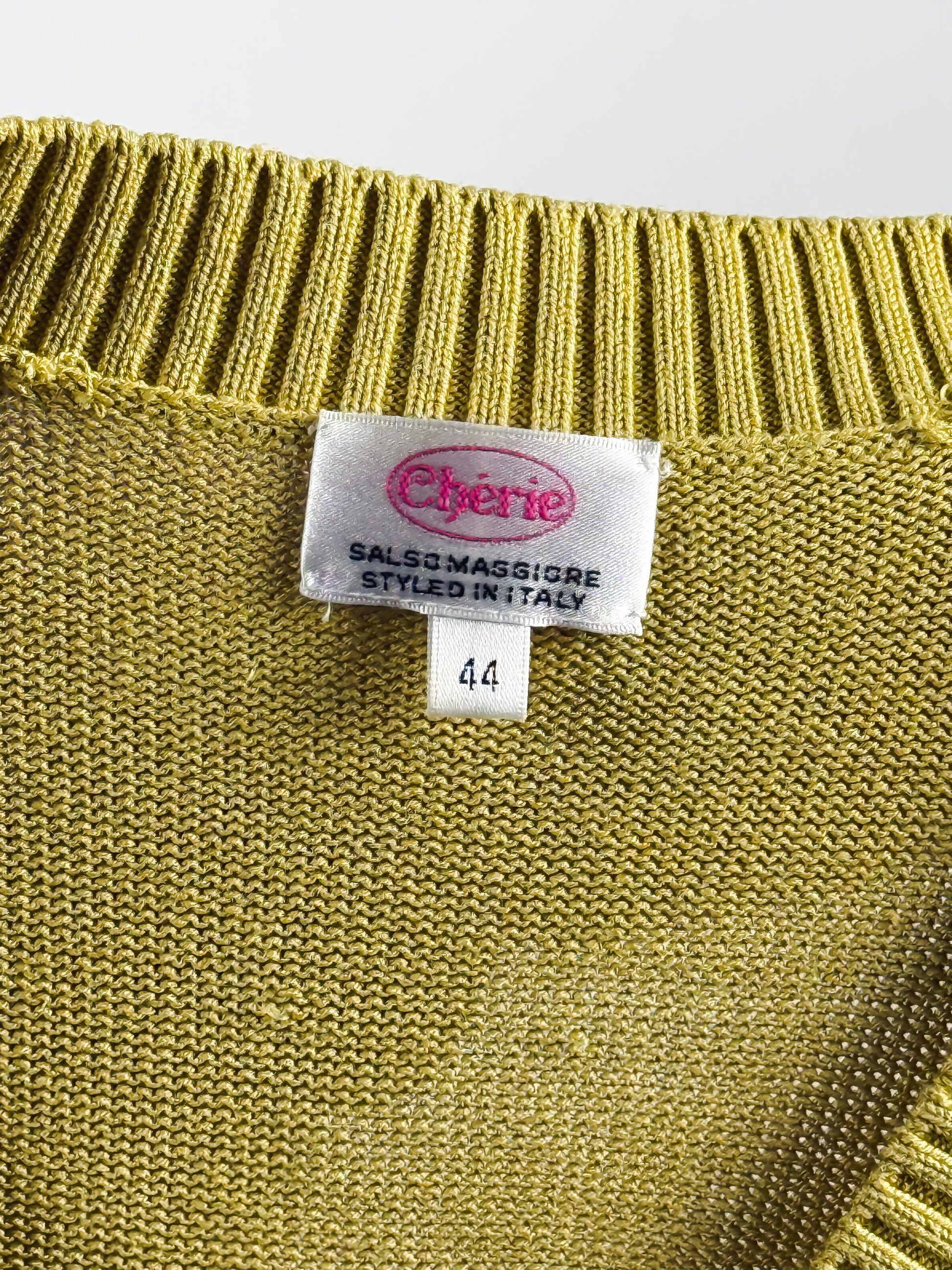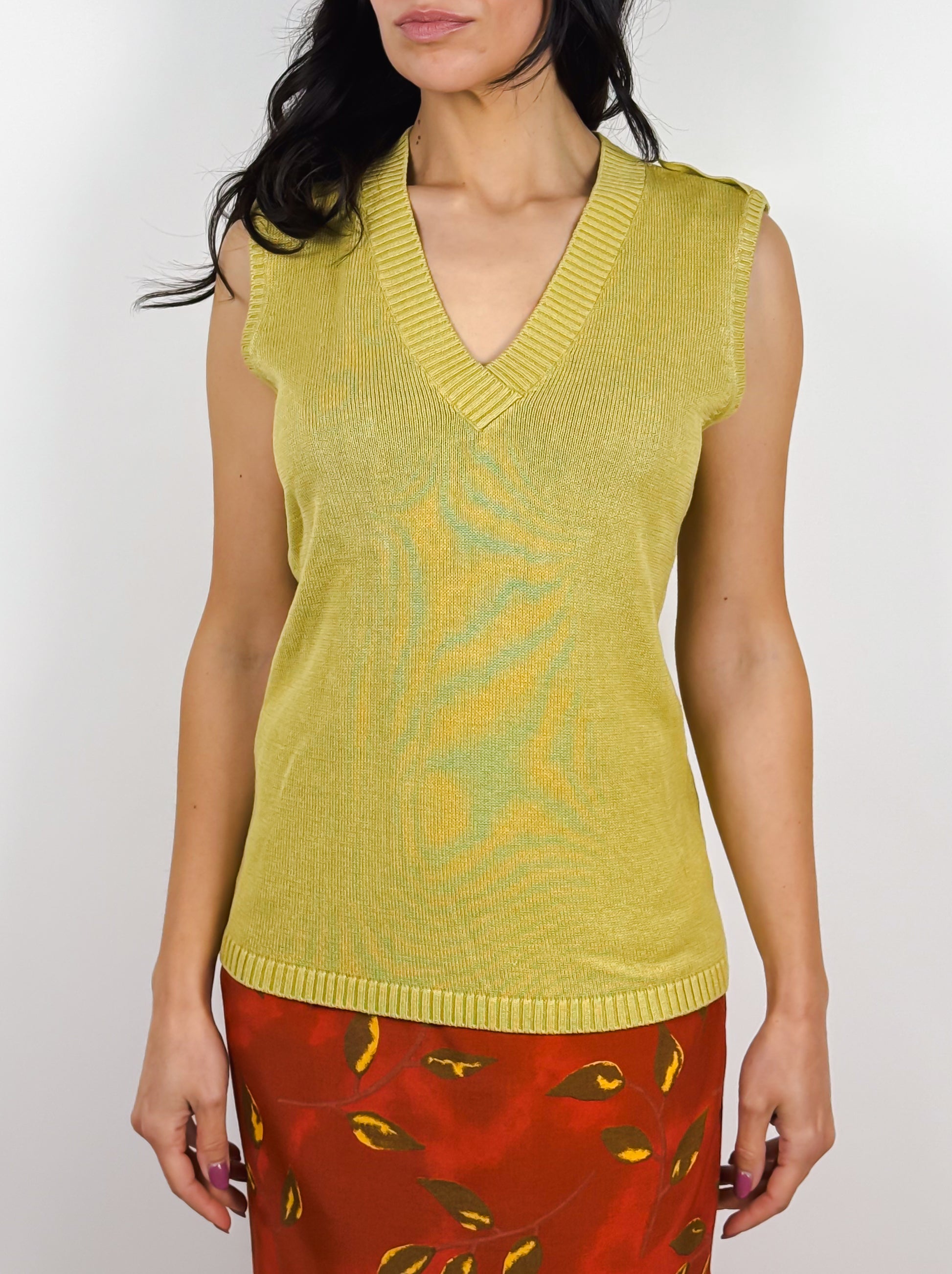 Gilet vintage firmato Cherie, un capo Made in Italy. Realizzato in pregiata maglina di seta, dalla texture sottile e leggera. Il colore dona carattere al look mantenendo un’eleganza delicata. Design essenziale con scollo a V e giromaniche, perfetto da indossare sopra bluse, camicie o a pelle, sia per look casual-chic che per abbinamenti più audaci in stile anni ’70 o Y2K.