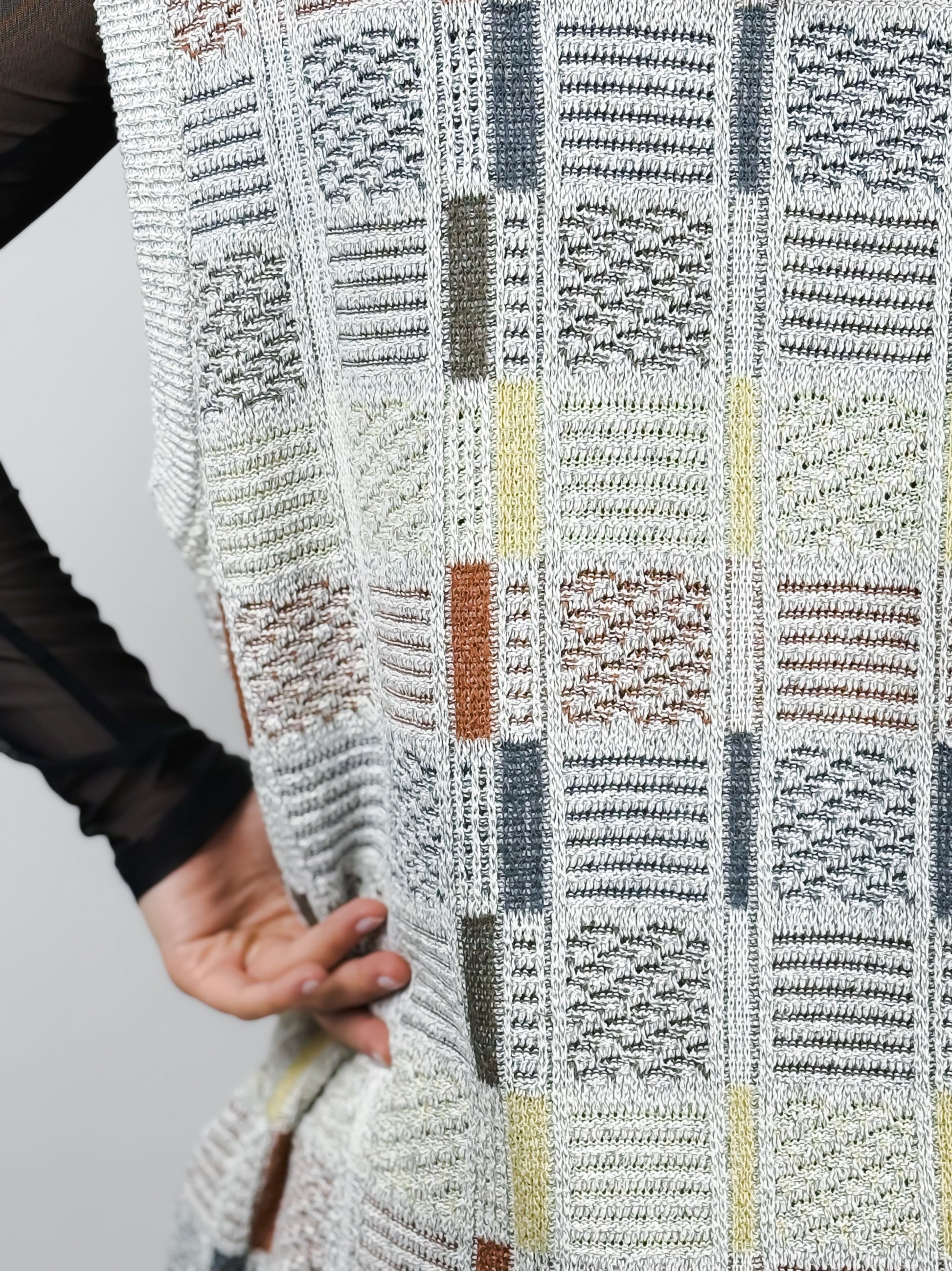 Gilet vintage da uomo, in maglina di cotone grigia con fantasia geometrica vivace sui toni del giallo, arancione e blu, che dona un tocco grafico e giocoso a un classico del guardaroba. In perfetto stile anni 2000. Lo scollo a V e il tessuto leggero lo rendono un capo versatile, perfetto da indossare da solo nelle giornate più miti o sopra una camicia per un layering d'effetto.