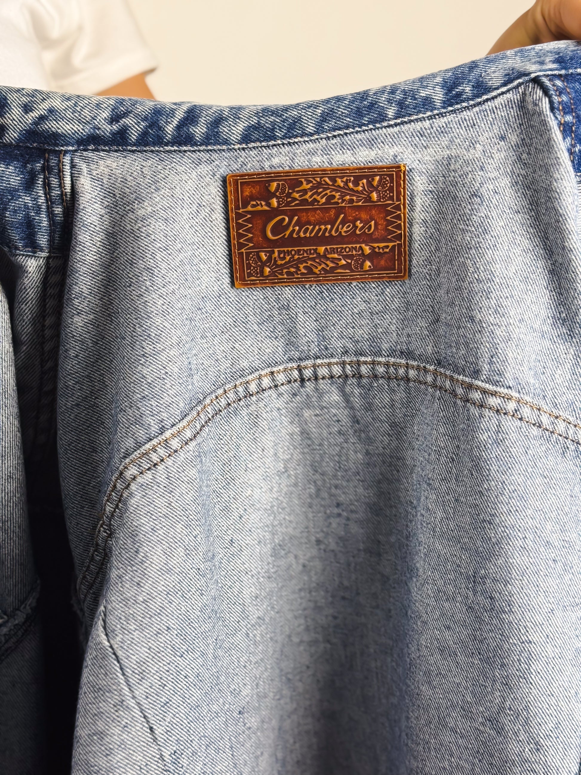 Un capo iconico che incarna lo spirito dell’abbigliamento casual anni '90. Giubbino di jeans vintage Chambers Phoenix Arizona, realizzato in denim di alta qualità a lavaggio chiaro, perfettamente vissuto e morbido, senza perdere struttura. Dotato di bottoni in metallo con logo inciso, presenta due tasche con pattina sul petto (una delle quali decorata con il logo ricamato Chambers) e due tasche a filetto laterali per una funzionalità completa.