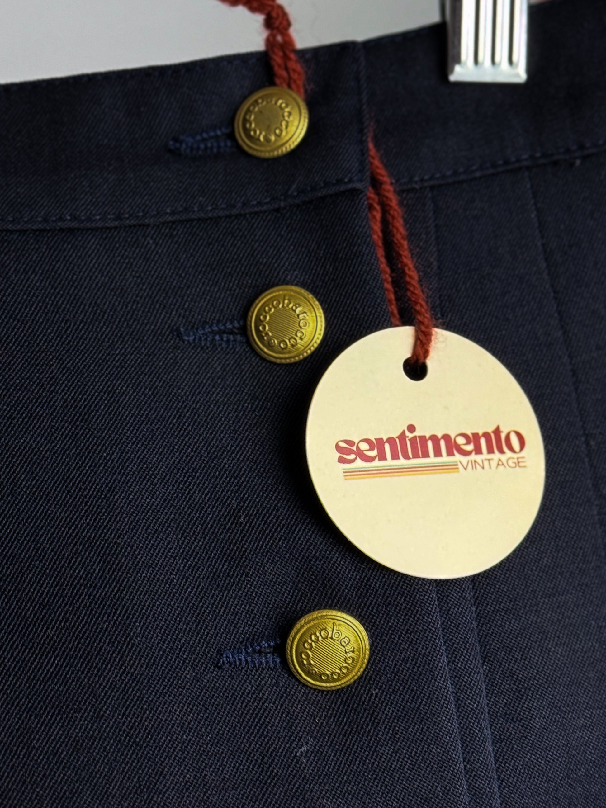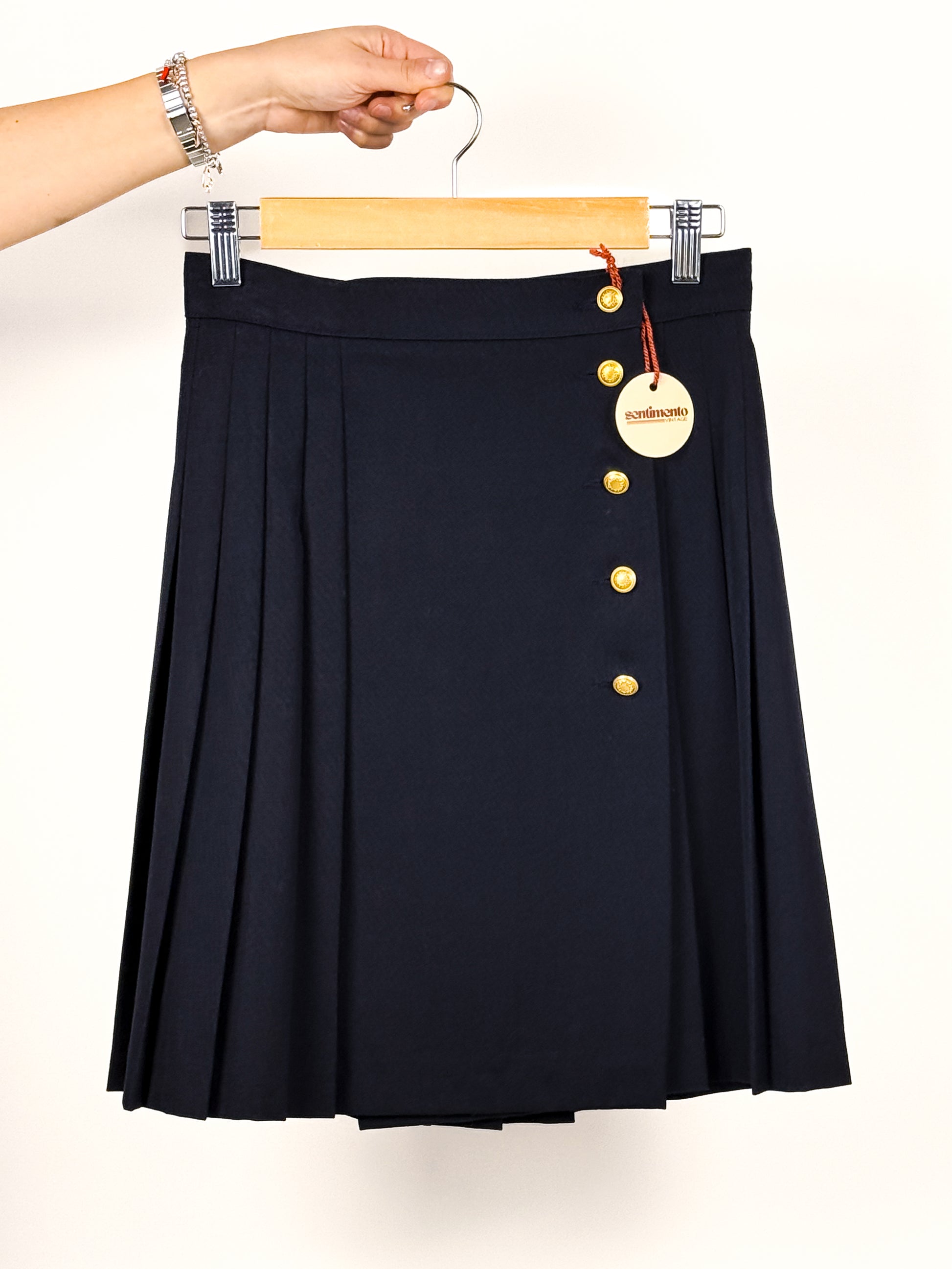 Gonna vintage a portafoglio Roccobarocco in pura lana blu. Modello plissettato con bottoni dorati logati laterali. Made in Italy, eccellente qualità.