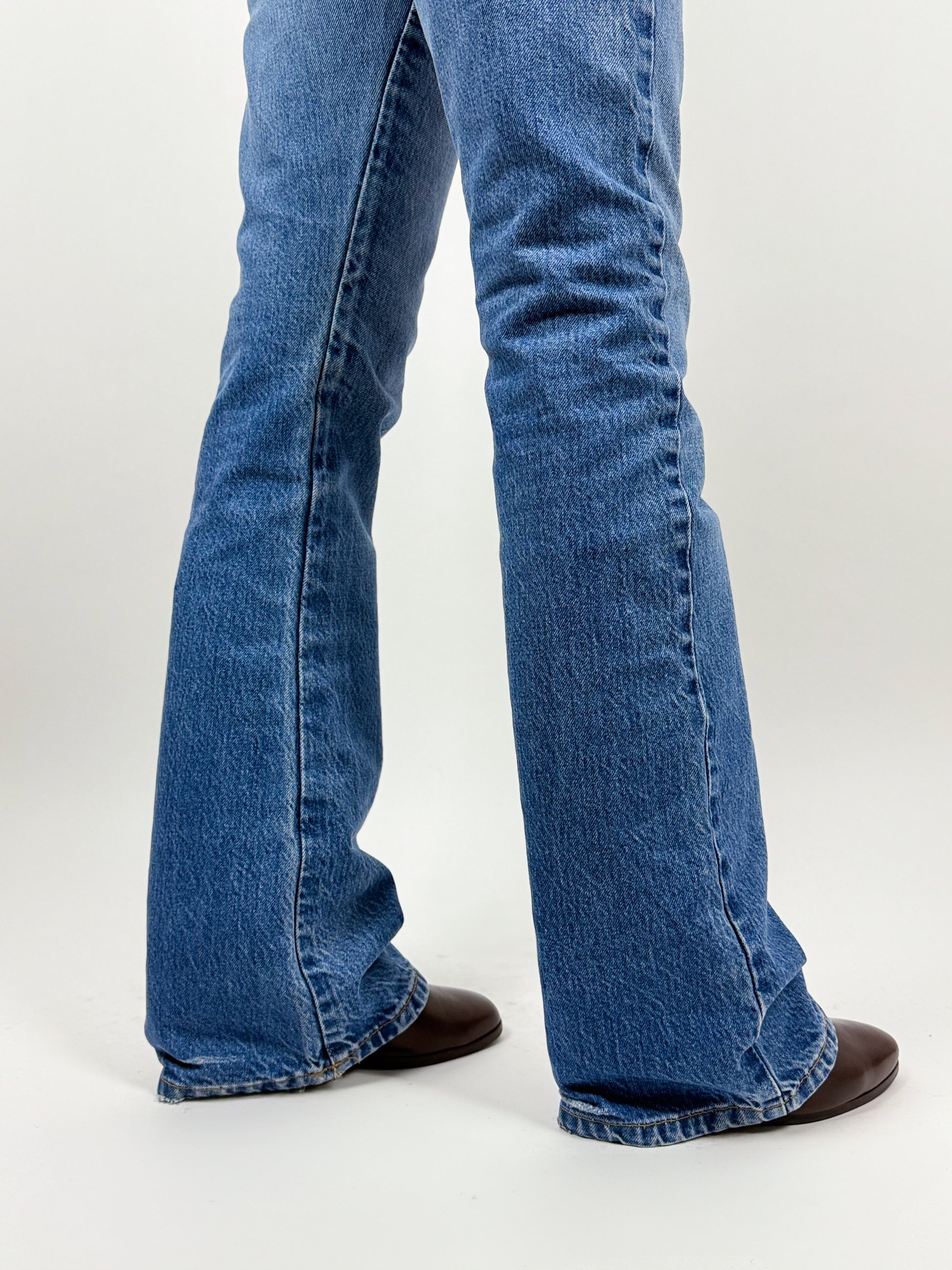 Jeans a zampa Energie anni ’90. Lavaggio chiaro, chiusura con zip e bottone. Logo su tasca posteriore.