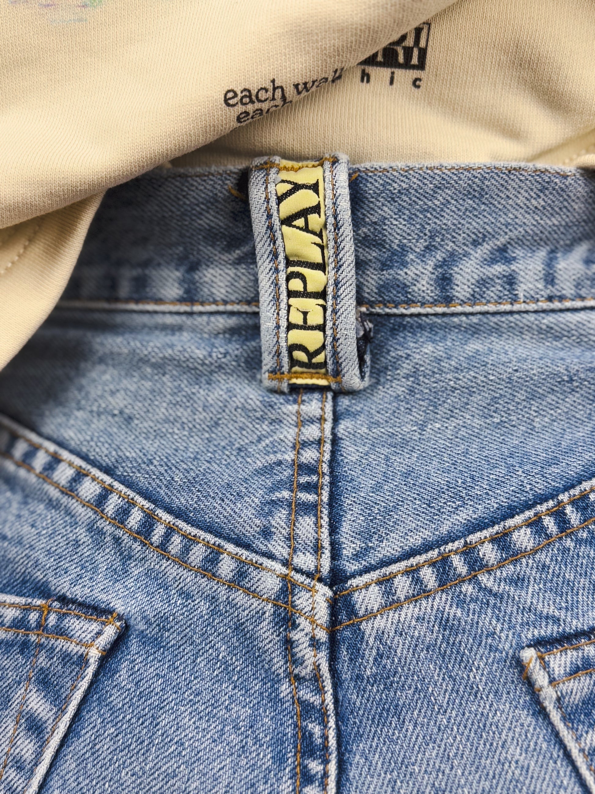 Jeans Replay anni ’90 in un bellissimo lavaggio chiaro, baggy a vita alta, modello 901 short, button fly con ultimo bottone a vista. Il passante centrale sul retro del jeans riporta il logo Replay su fondo giallo. Made in Italy