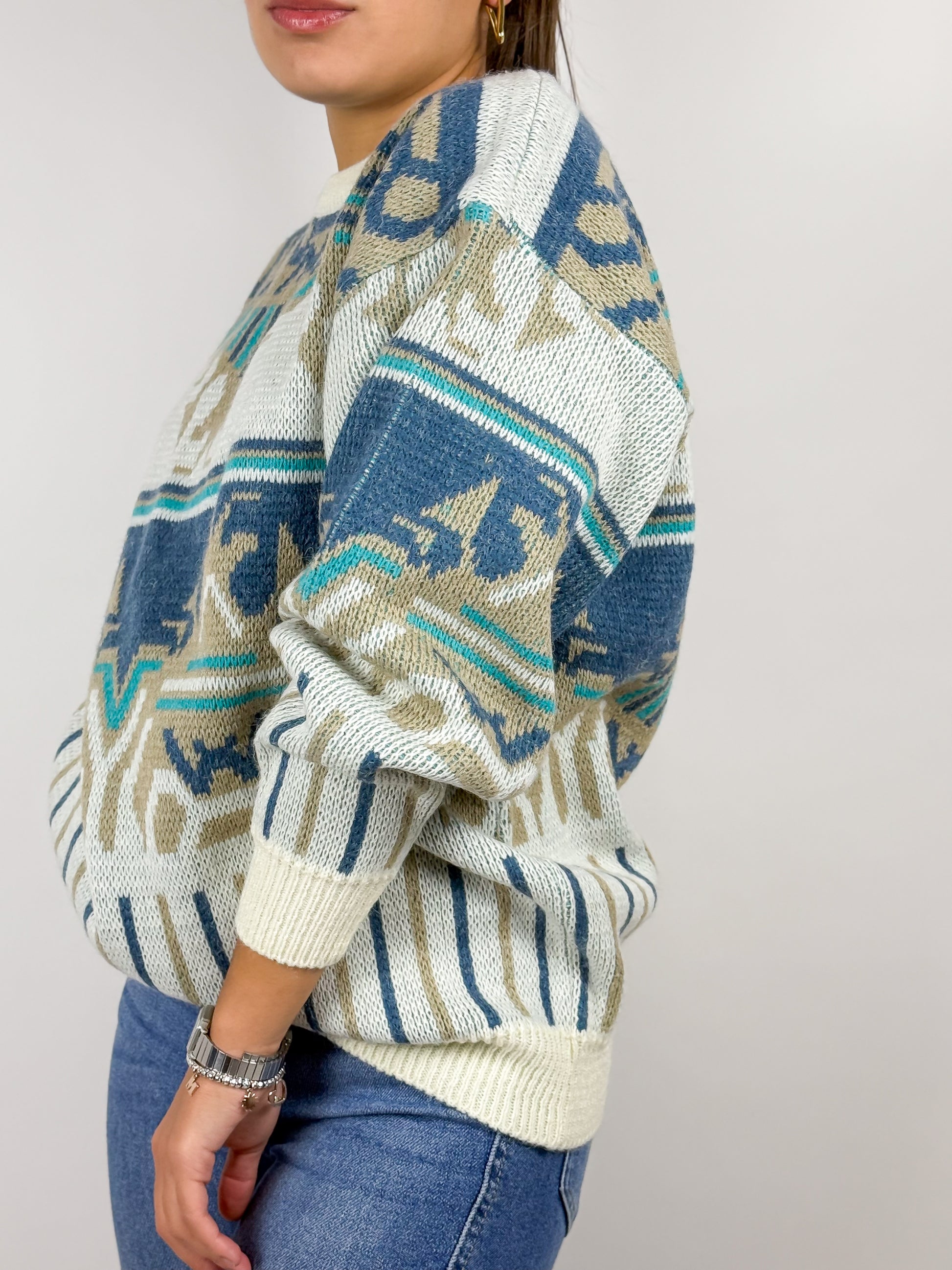Maglione vintage a girocollo con motivo geometrico con fondo panna e dettagli in beige blu e azzurro.