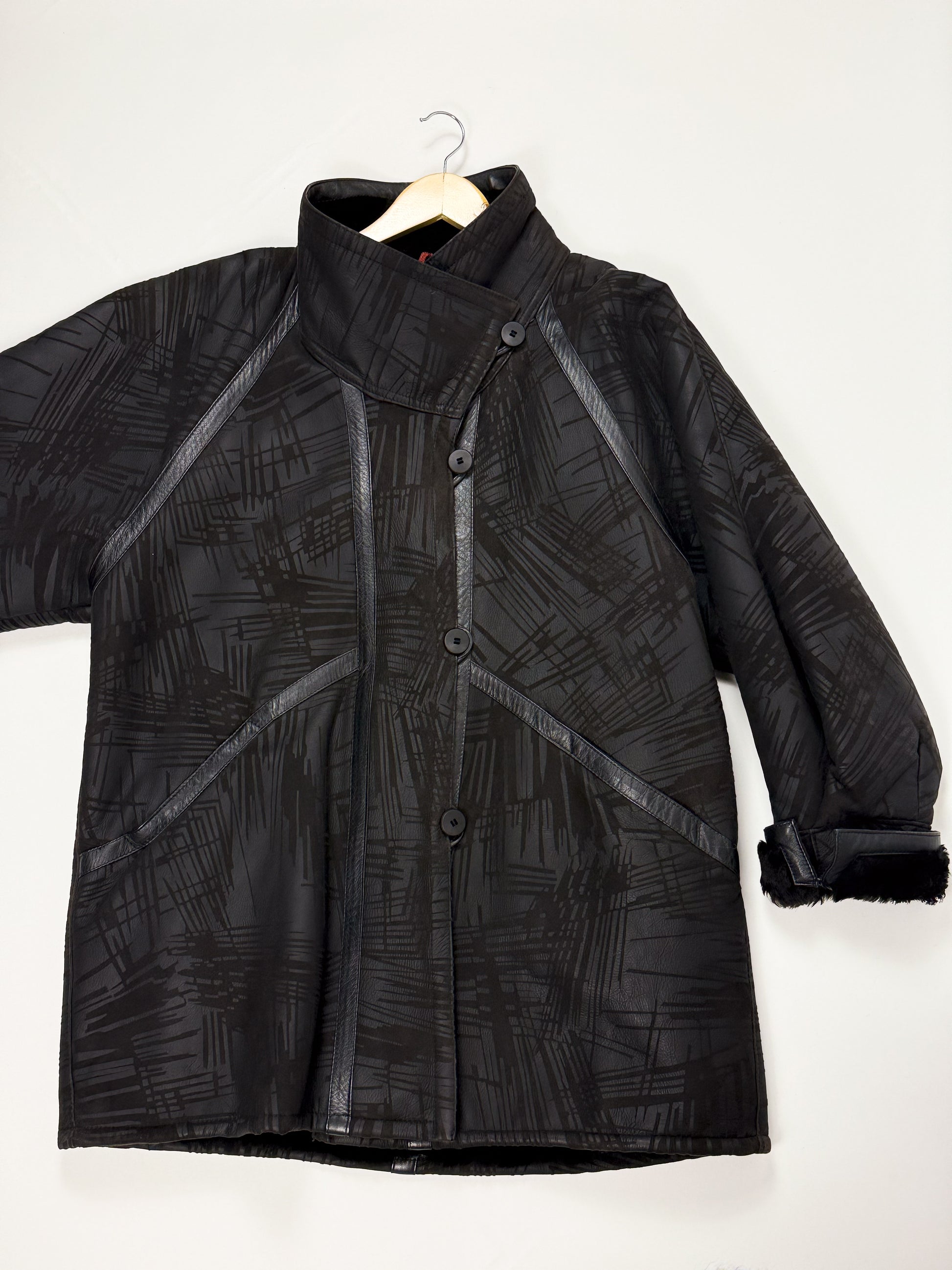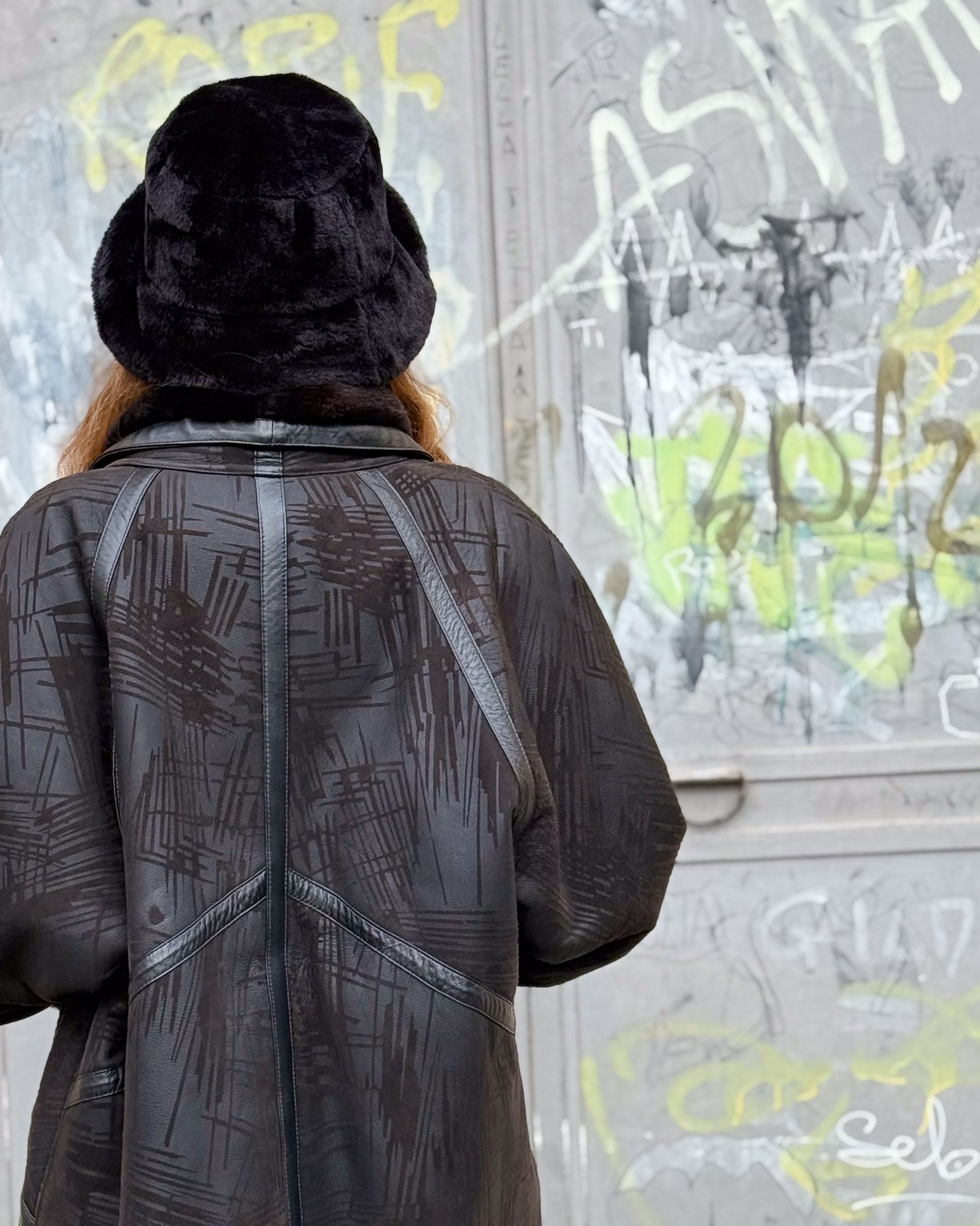 Montone donna testa di moro, esterno in morbida pelle con fantasia geometrica e imbottitura in calda pelliccia. Due tasche laterali e classica abbottonatura da montone con chiusura doppiopetto e un bottone sul collo per indossarlo a collo alto. Ottima manifattura, curato in ogni minimo dettaglio. Vestibilità ampia.