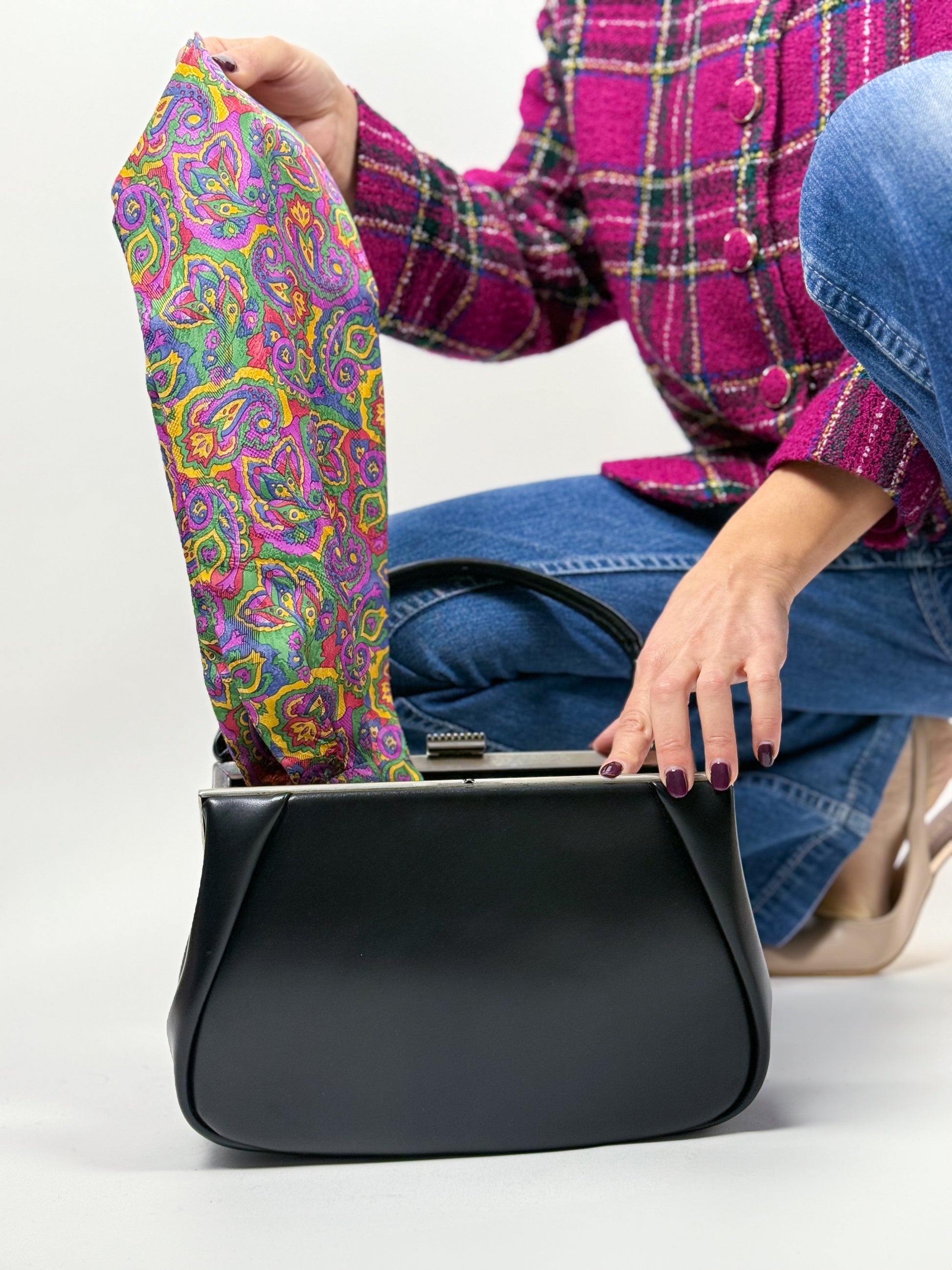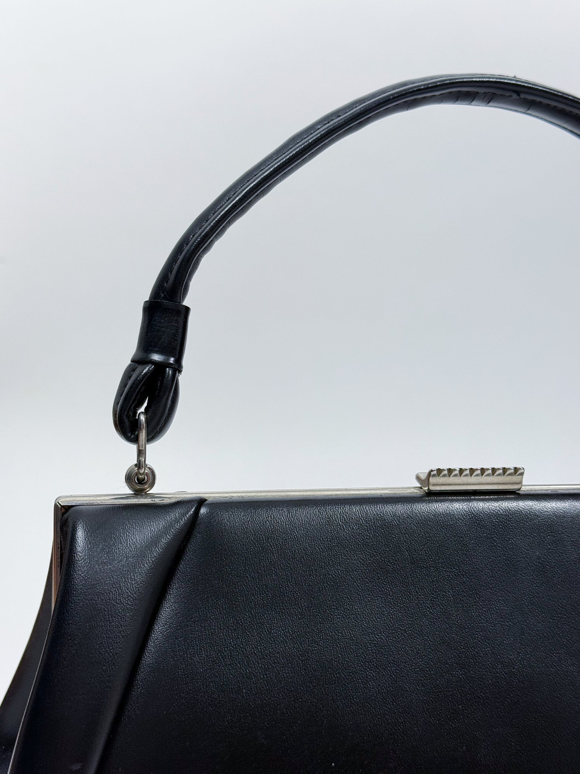 Borsa a mano in pelle nera anni ’60 con un unico manico. Pelle liscia e morbida senza alcun difetto. Chiusura a scatto e interno foderato.