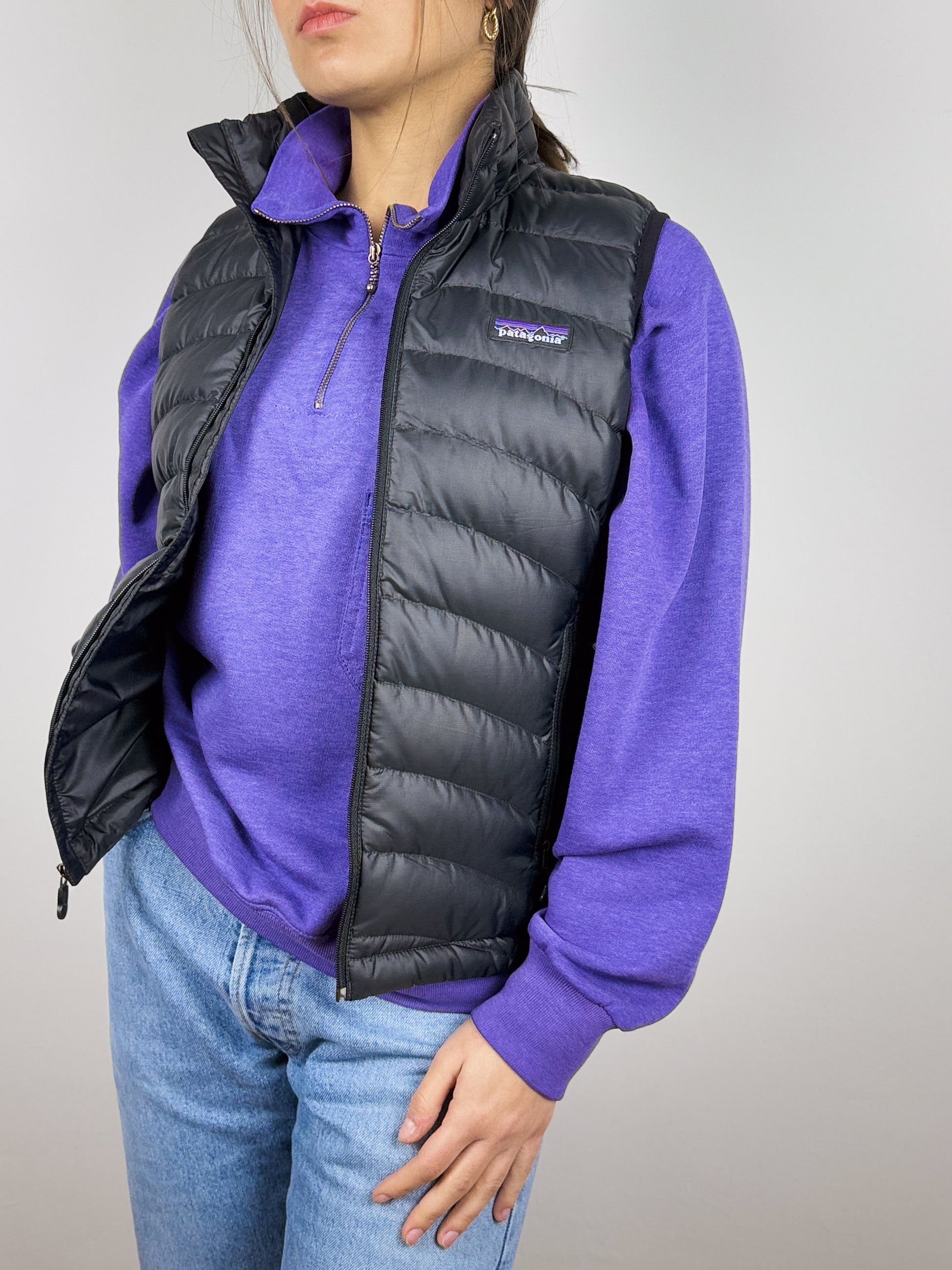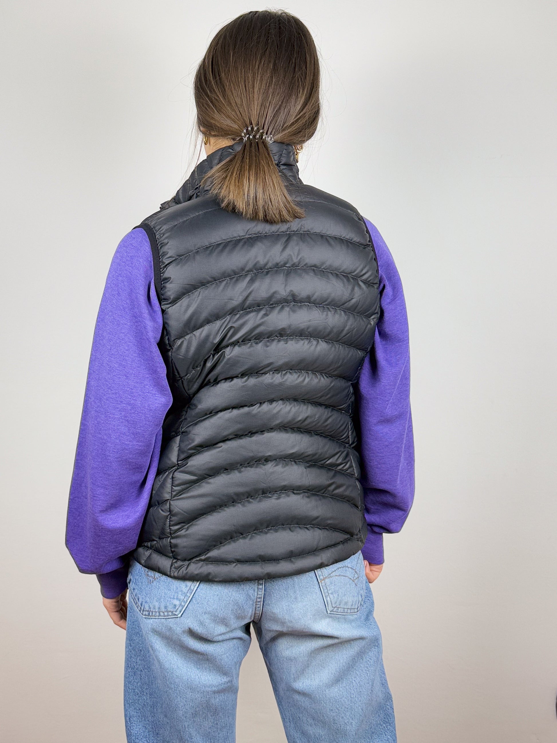 Smanicato donna Patagonia nero, due tasche laterali con zip, collo alto e tasca interna con zip. Caldo e poco ingombrante.