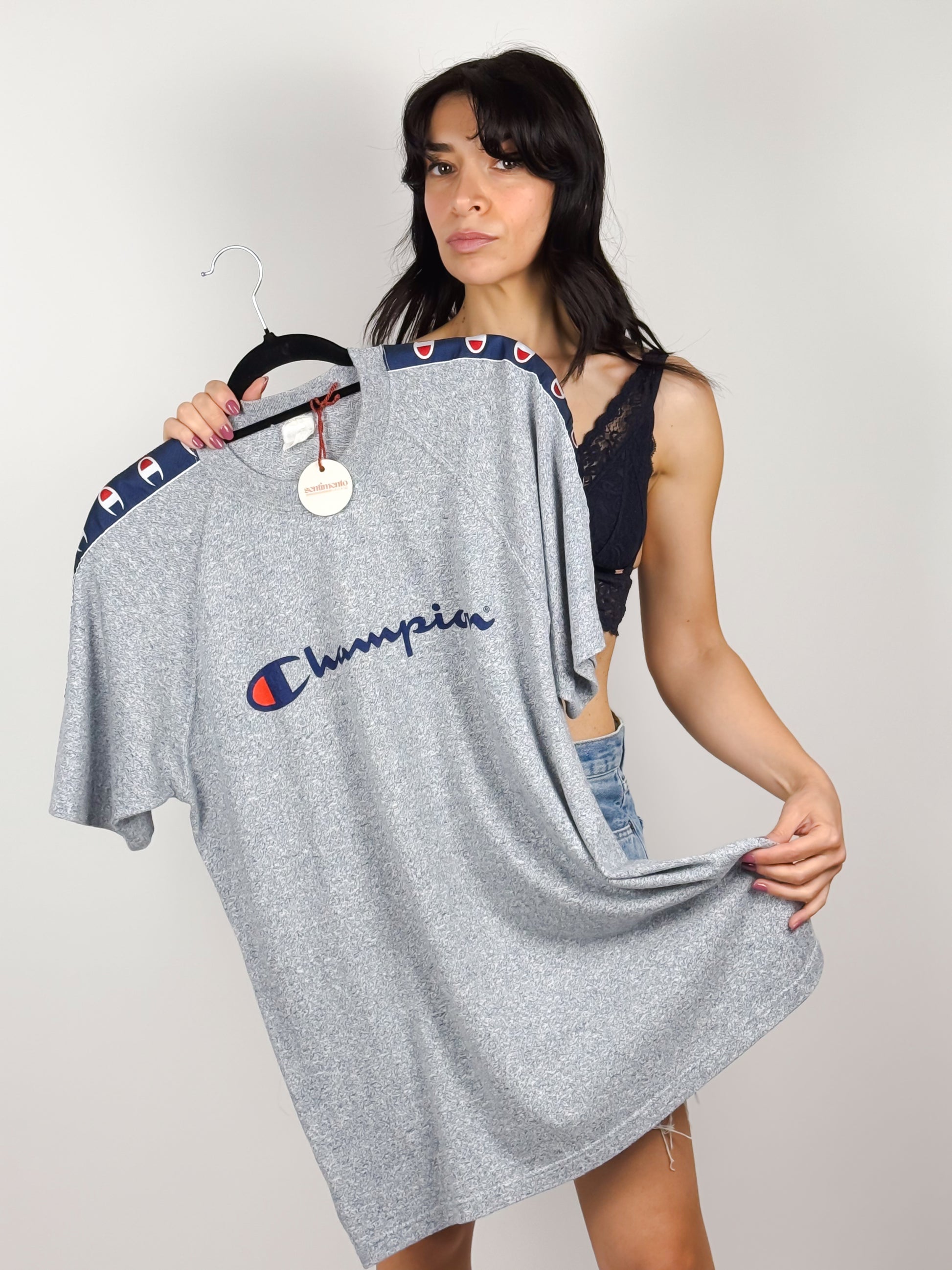 T shirt Champion anni '90 in cotone bianco e blu, con logo stampato sul petto e fascia con loghi sulle maniche corte.