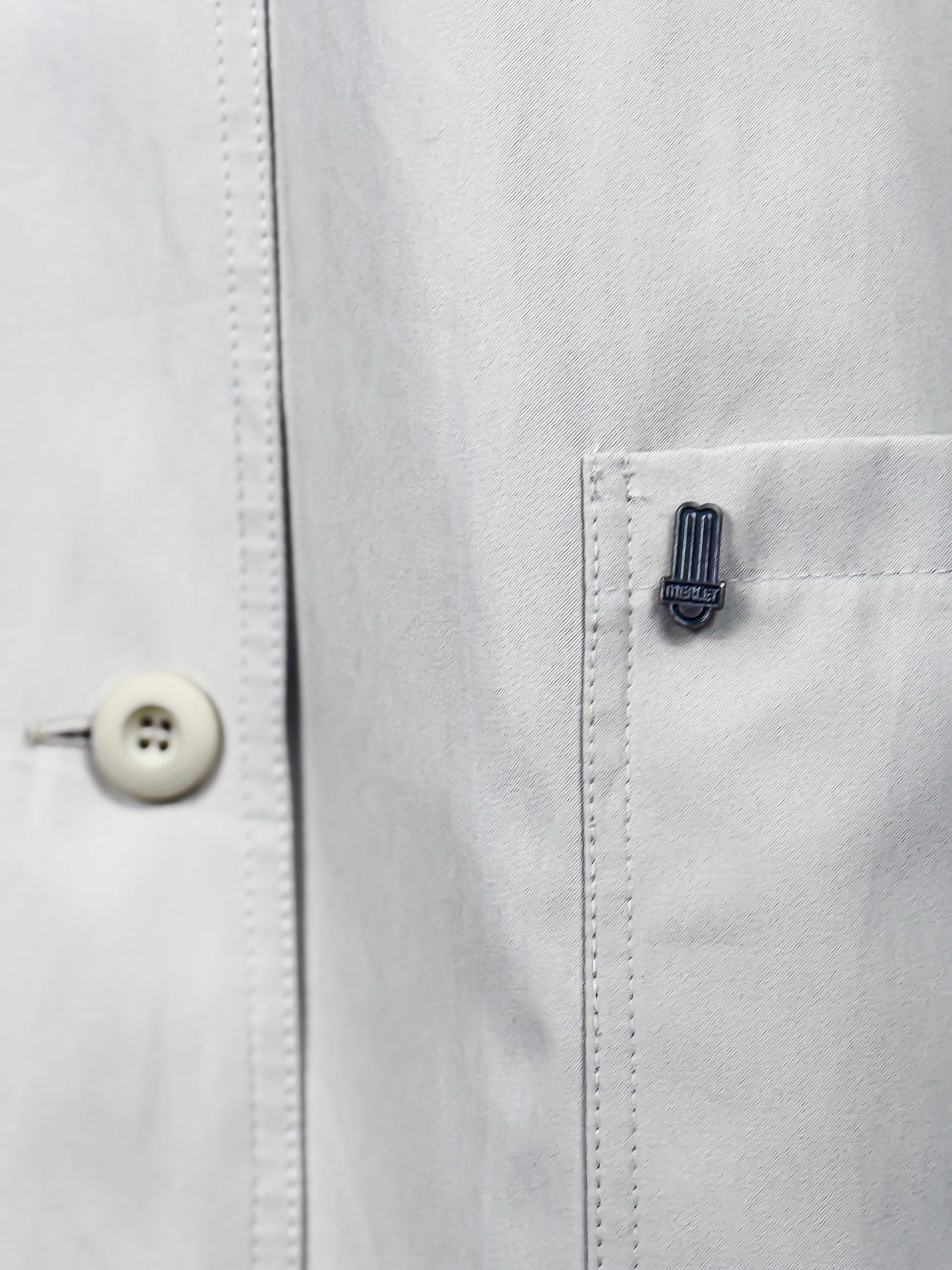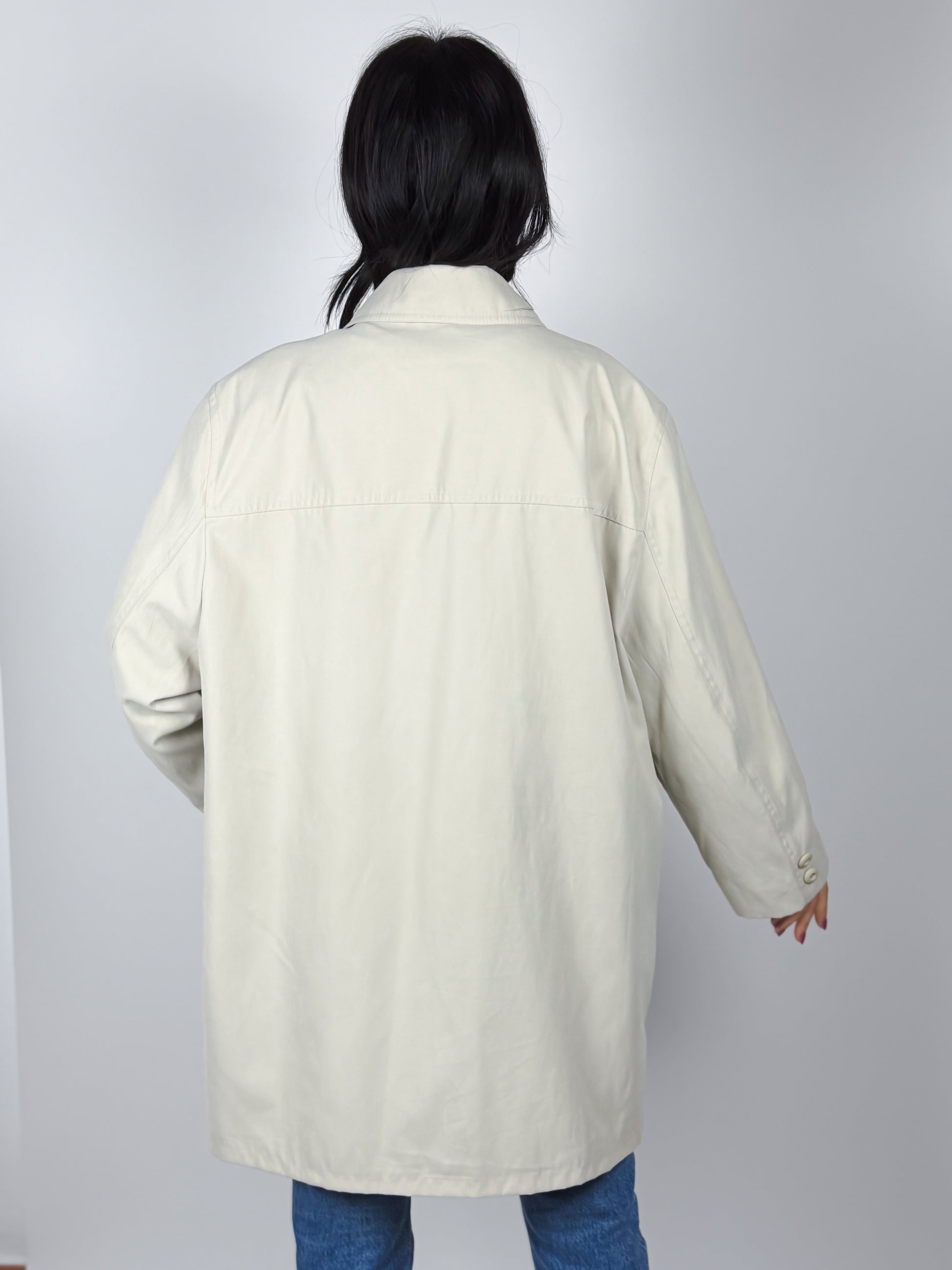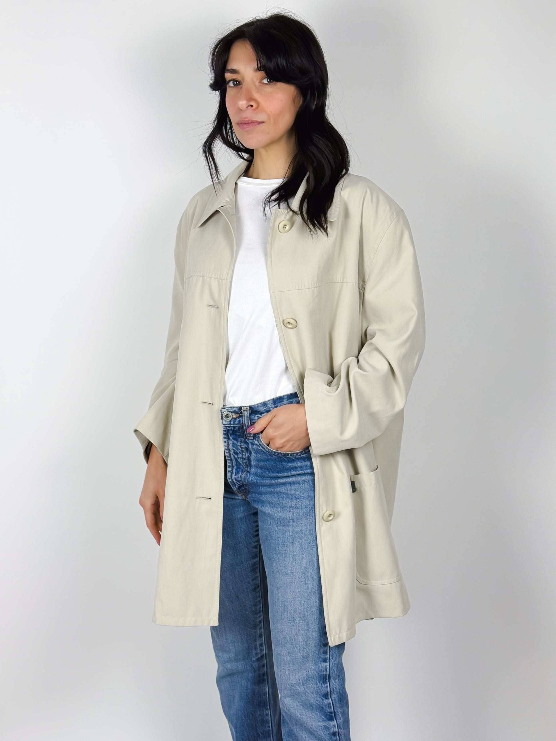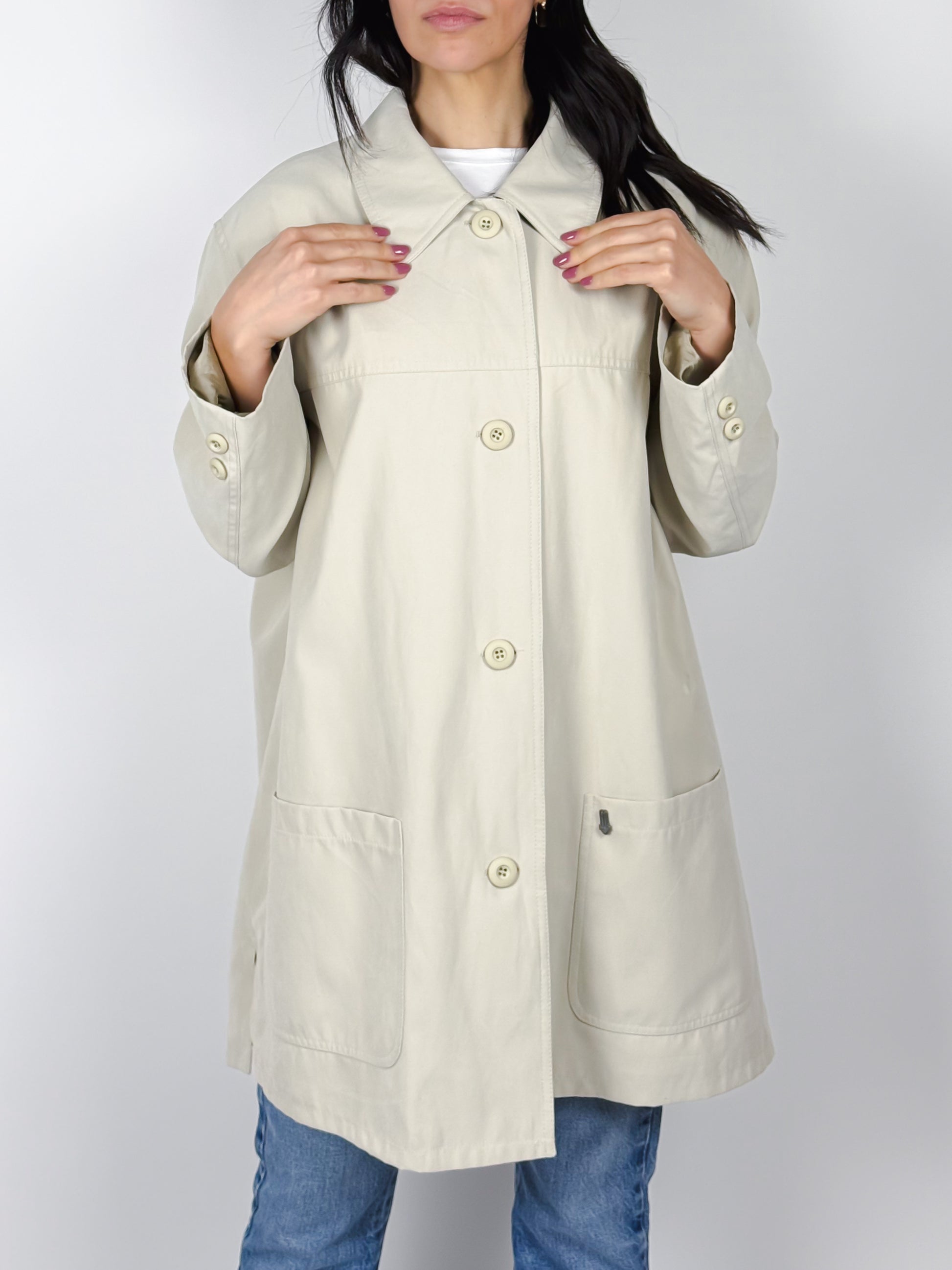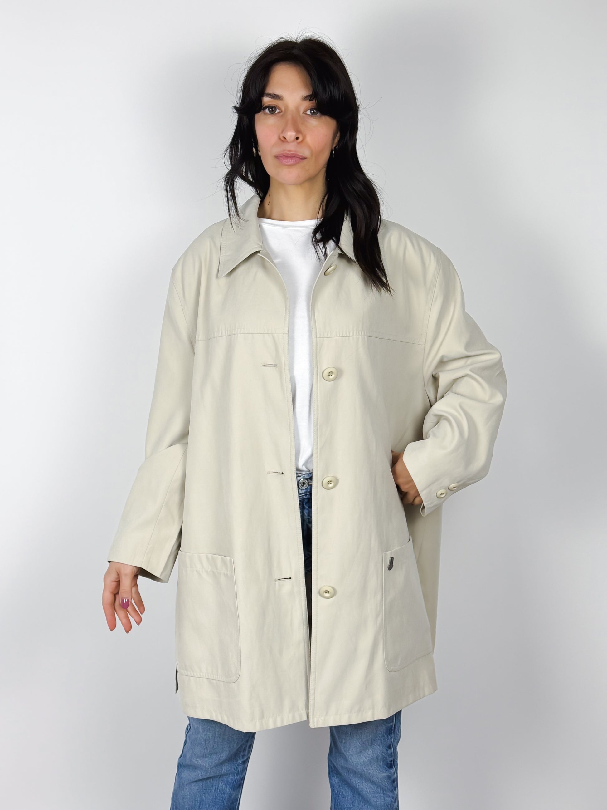 Trench beige corto scamosciato anni '80, Made in Italy marchio Merlet. Tessuto morbido e leggero con fodera di rivestimento in viscosa. Chiusura frontale con bottoni e tasche frontali. Due piccoli spacchi laterali e bottoni ai polsi. Spalline leggermente imbottite. Ottima qualità.