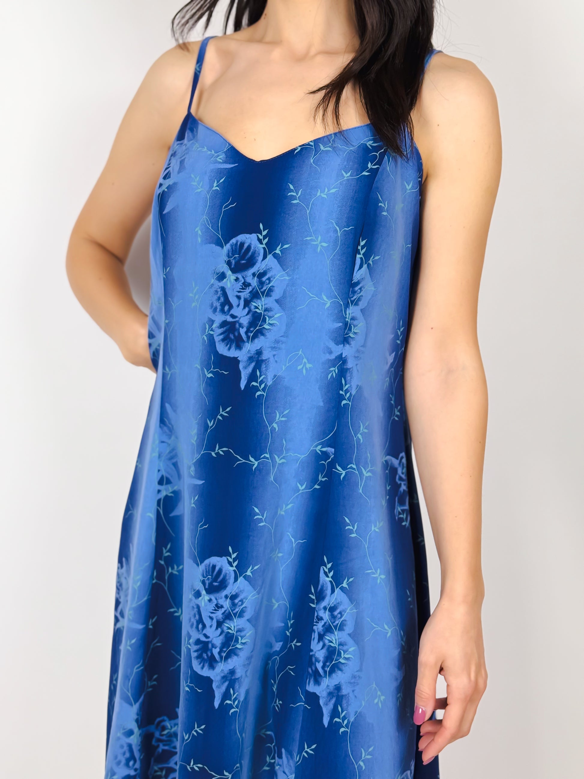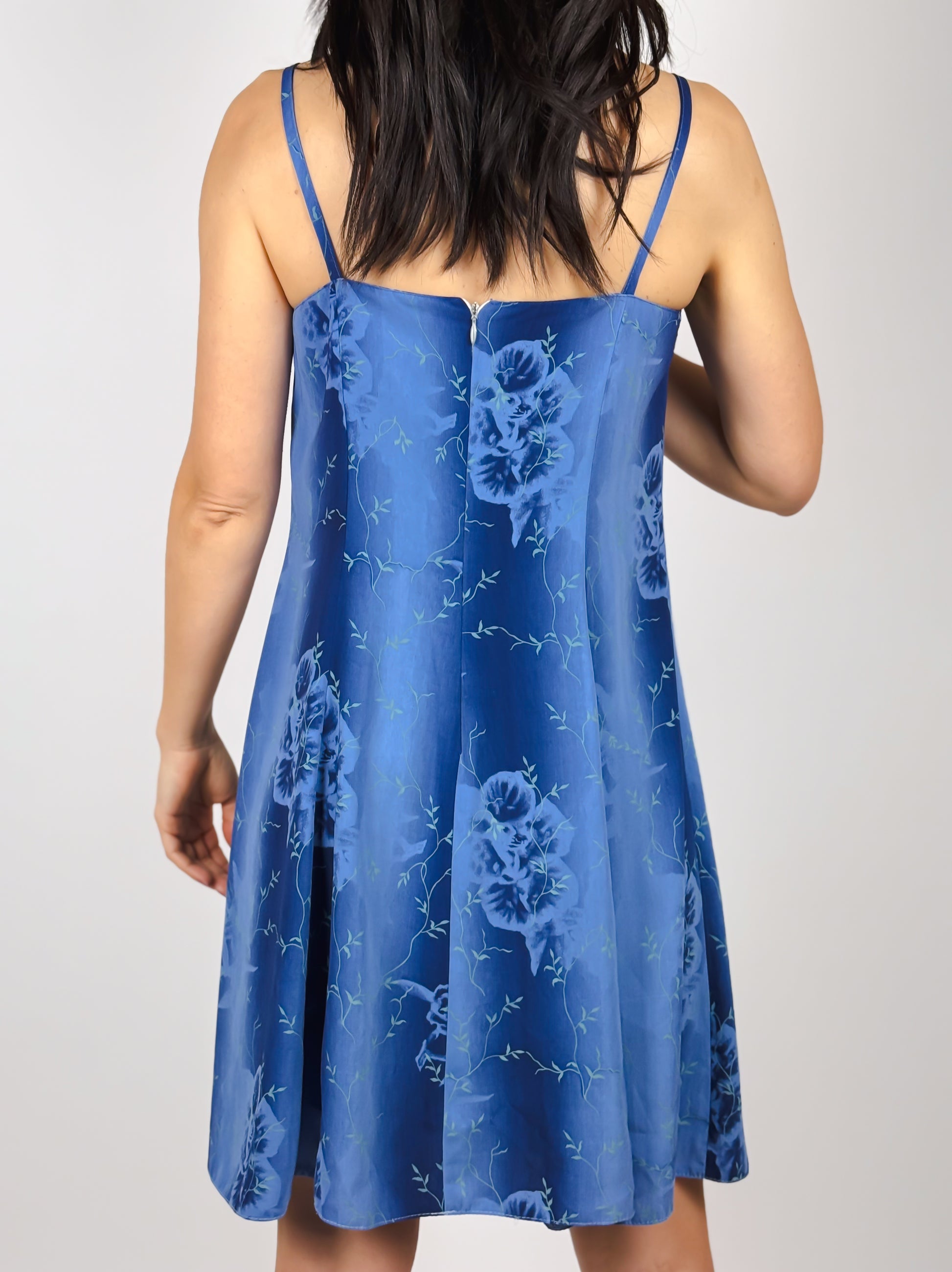 Vestitino anni 2000 con sfumature blu e celesti e fantasia floreale a colore. Vestito leggero a bretelline con zip sulla schiena, leggermente svasato sul fondo. Ottima qualità, tessuto fresco.